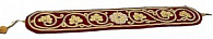 Пояс длиной 74 см, шириной 13 см и изготовлен из красного бархата. Украшен узором, шитым золотыми нитями. Рисунок узора – вьющиеся стебли и листья аканта. Дополняют его вставки из жемчуга и обводка золотым шнуром. В центре пояса – равноконечный крест, по контуру выложенный жемчугом, внутри заполнен золотым шитьем. В середине креста – небольшой изумруд в серебряной оправе. По концам крест обрамлен крупным жемчугом и мелкими самоцветными камешками зеленого цвета. По краям пояса – две ленты золотистого цвета, длиной по 17 см, украшенные кистями из золотистого бисера. Подкладка пояса – тот же красный бархат.