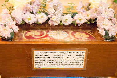 В тот день, 25 ноября 2011 года, монастырский пояс был принят отцом Ефремом для того, чтобы отвезти его в Ватопед для освящения. В течение 6 месяцев пояс находился в алтаре соборного храма Ватопедской обители, и был освящен на многих хранящихся в Афонском монастыре святынях. В конце мая 2012 года он был передан в Зачатьевскую обитель с удостоверением, свидетельствующем о его пребывании в Ватопеде и с благословением Святой Горы Афон.