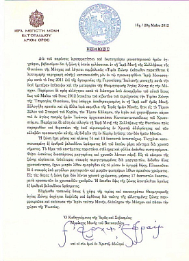 Настоящим священнозапечатанным и подписанным монастырским актом удостоверяем, что пояс, который хранится в Священной Обители Зачатия Богородицы города Москвы и символично называется «Честной Пояс» (ниже приводится его детальное описание), изготовлен в вышеуказанном Священном Монастыре в 2011 г. при игуменстве Герондиссы монахини Иулиании во время нашего там пребывания и принесения Богородичного Святого Пояса в Москву. Оставался же он для освящения, в период с декабря того же года по май 2012 г., под ковчегом с Честным Поясом Пресвятой Богородицы, которая, как сокровище, хранится в нашей Священной Обители. Также благословлен он на других святынях нашей Обители: Честном Древе, Честной Трости, священной и благодатоточивой главе иже во святых отца нашего Иоанна, архиепископа Константинопольского, Златоуста. Передается этот пояс в благословение Священной Обители Зачатия Богородицы для утешения и исцеления находящегося в ней во Христе сестричества и благоговейнных паломников, в знак о Господе любви наших двух Обителей.