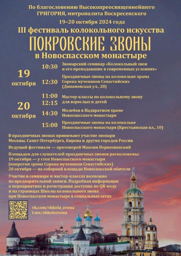 19-20 октября 2024 года в Москве состоится III фестиваль колокольного искусства «Покровские звоны в Новоспасском монастыре». Фестиваль проводится по благословению Высокопреосвященнейшего Григория, митрополита Воскресенского, первого викария Святейшего Патриарха Московского и всея Руси по г. Москве, наместника Новоспасского ставропигиального мужского монастыря.