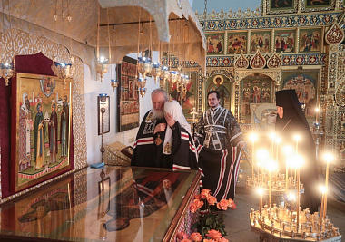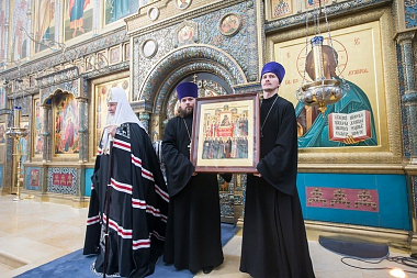 По окончании богослужения Предстоятеля Русской Церкви приветствовала игумения Иулиания, которая преподнесла Его Святейшеству икону Торжества Православия.