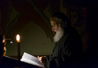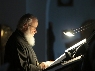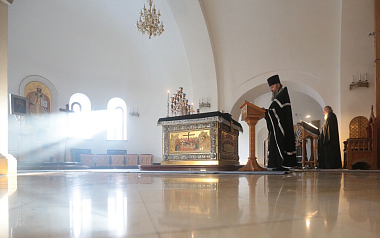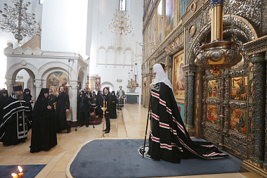 В алтаре собора Рождества Пресвятой Богородицы Предстоятель Русской Православной Церкви молился за уставными богослужениями: утреней, часами, изобразительными и вечерней.