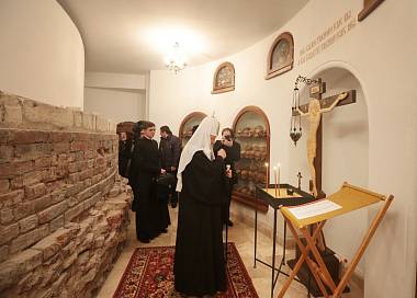 Затем в сопровождении игумении Иулиании Святейший Владыка посетил помещения, расположенные в нижней части собора Рождества Пресвятой Богородицы, – храмы в честь Иконы Божией Матери «Неопалимая Купина» и в честь Собора преподобных отец и жен, в подвиге просиявших, костницу с останками, найденными в ходе археологических работ перед началом строительства собора, церковно-исторический музей и классные комнаты Воскресной школы.