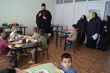 Отец Владислав побеседовал с детьми о празднике Рождества Христова и заповедях Господних, сестры исполнили традиционные колядки, дети с увлечением отвечали на вопросы небольшой рождественской викторины и тоже спели гостям разученную к празднику песню.