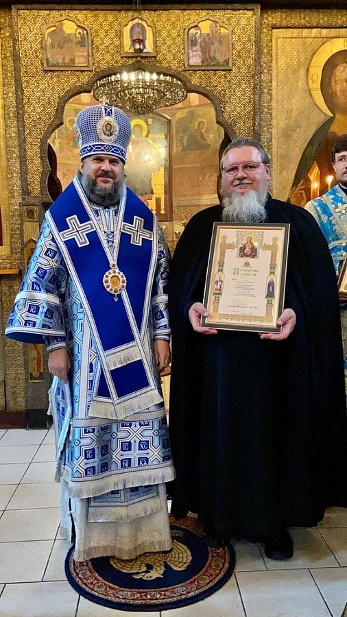 После поздравительной речи архиепископ Амвросий вручил Патриаршие грамоты монаху Гавриилу (Чумаченко), начальнику скита преподобного Серафима Саровского Сретенского монастыря, и Галине Зайцевой, сотруднице Сретенского монастыря.