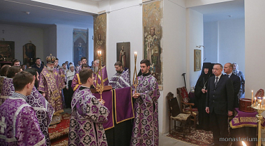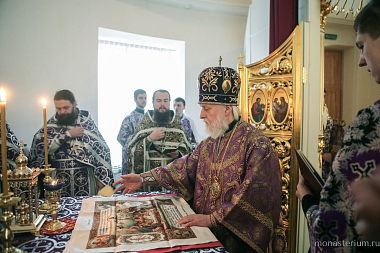 «Поздравляю всех молящихся с престольным праздником. Сейчас мы переживаем святые дни. Минувший воскресный день именовался Неделей Крестопоклонной. В это время в храмах выносится крест и мы все преклоняем перед ним колена. Таким образом Церковь нам напоминает о Крестных страданиях Господа нашего Иисуса Христа. Это своего рода преполовение Святой Четыредесятницы, и мы вступаем во вторую половину Великого поста.
