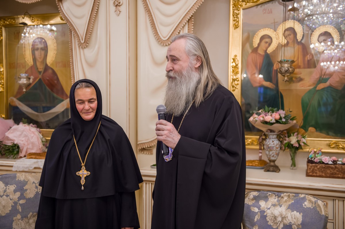 За праздничной трапезой матушка Феофания поделилась своими воспоминаниями о начале возрождения обители. Всем присутствовавшим были продемонстрированы архивные видеоматериалы 1995–1997 гг., на которых запечатлены первые годы возрождения монастыря.