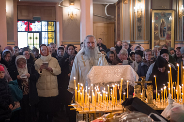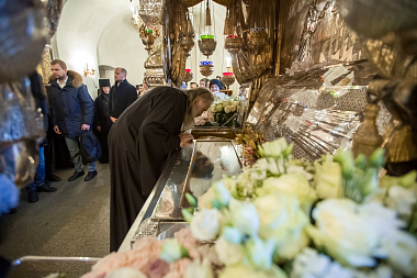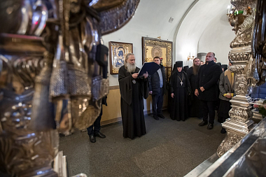 Далее насельницы обители сопроводили архипастыря к мощам блаженной Матроны Московской, где было совершено славление и прочитана молитва святой старице.