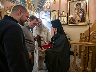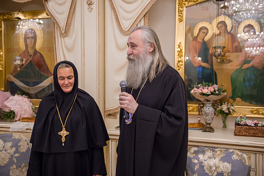 По завершении богослужения владыка Феогност огласил поздравление Святейшего Патриарха Московского и всея Руси Кирилла в адрес игумении Феофании: