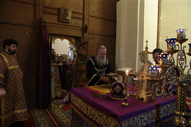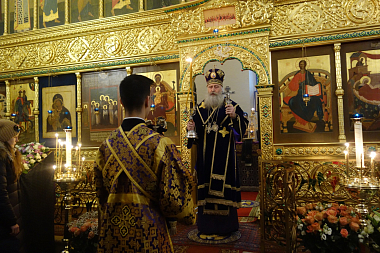 По окончании богослужения Высокопреосвященнейший владыка прочел молитву перед иконой с частицей мощей св. мученика Викторина.