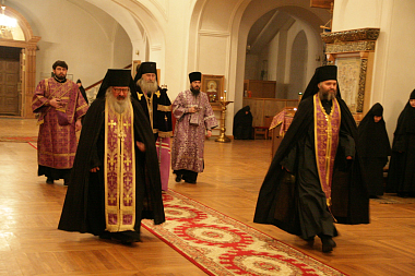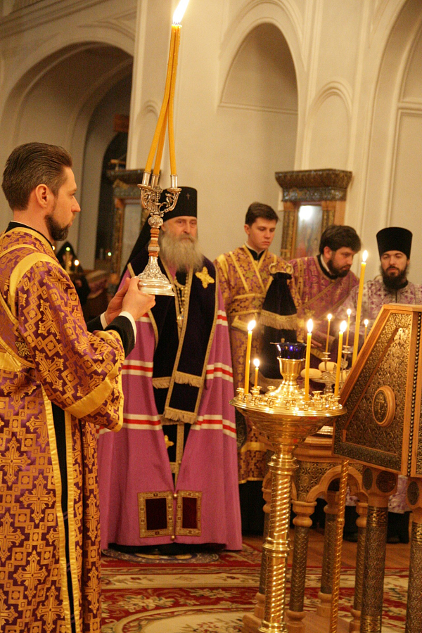Вечером этого дня, накануне Недели 2-й Великого поста, дня памяти свт. Григория Паламы, архиепископа Фессалонитского, Его Высокопреосвященство возглавил воскресное всенощное бдение в Казанском соборе монастыря.