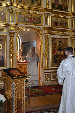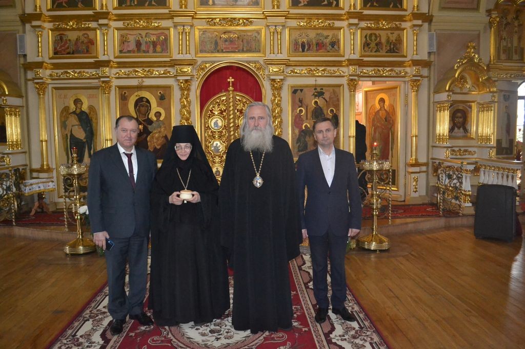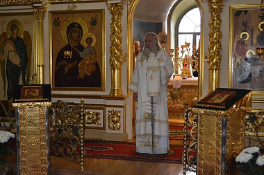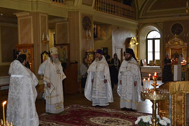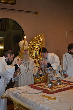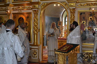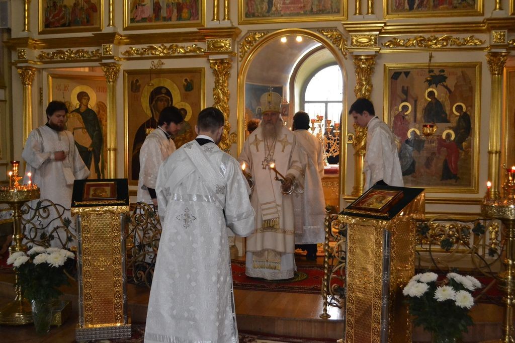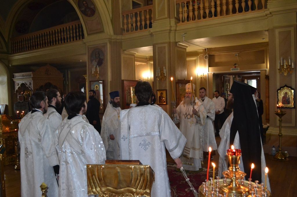 Его Высокопреосвященству сослужили владыки клирики обители: иереи Вадим Купцов и Алексий Горячкн, иеромонах Михаил (Булочев).