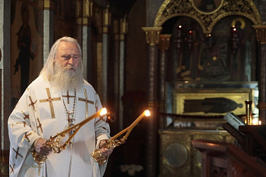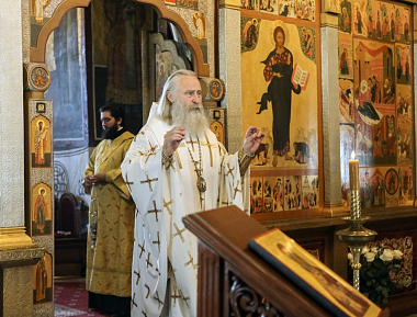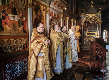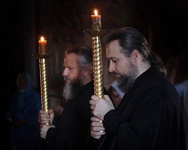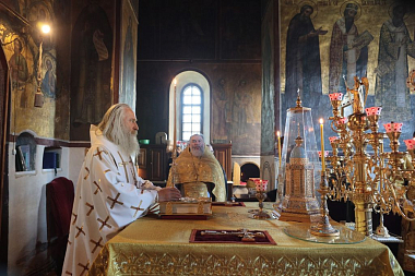В монастырском соборе Рождества Пресвятой Богородицы Его Высокопреосвященству сослужили наместник обители архимандрит Павел (Кривоногов) с братией в священном сане.