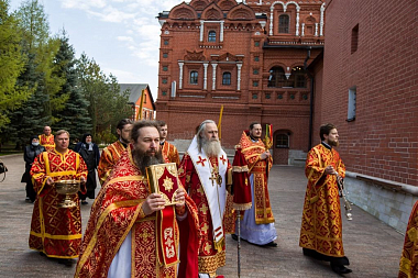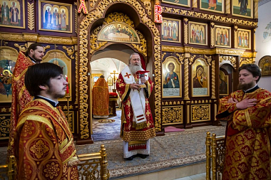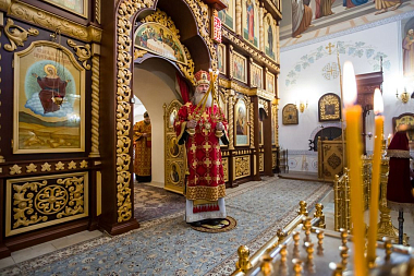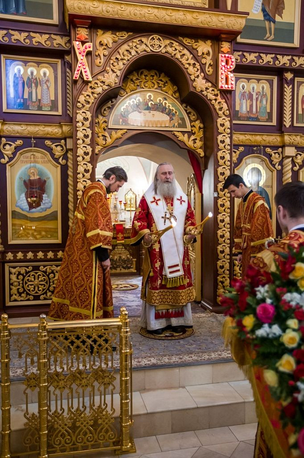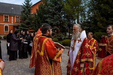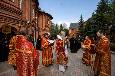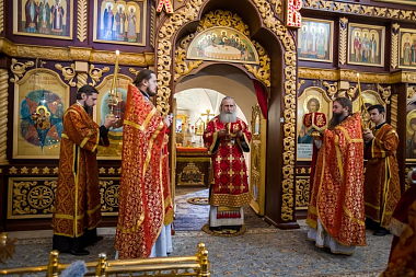 За Литургией в храме Казанской иконы Божией Матери Его Высокопреосвященству сослужили клирики обители.
