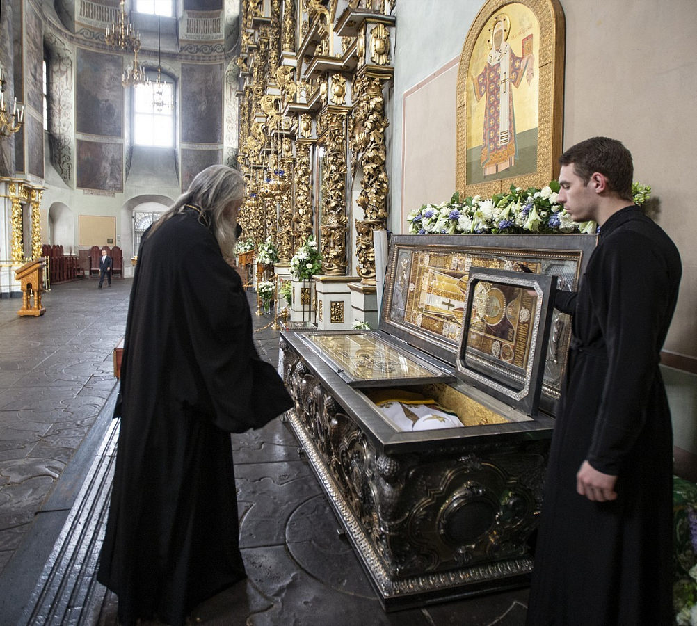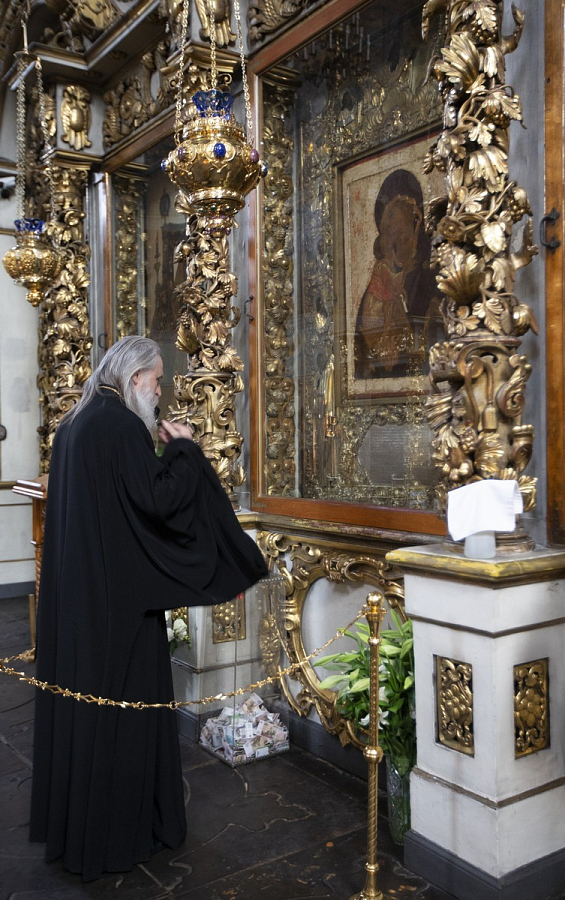 Затем Его Высокопреосвященство проследовал в Большой собор Донского монастыря, где поклонился честным мощам святителя Тихона, Патриарха Московского и всея России, и Донской иконе Божией Матери и совершил славление святителю Тихону.