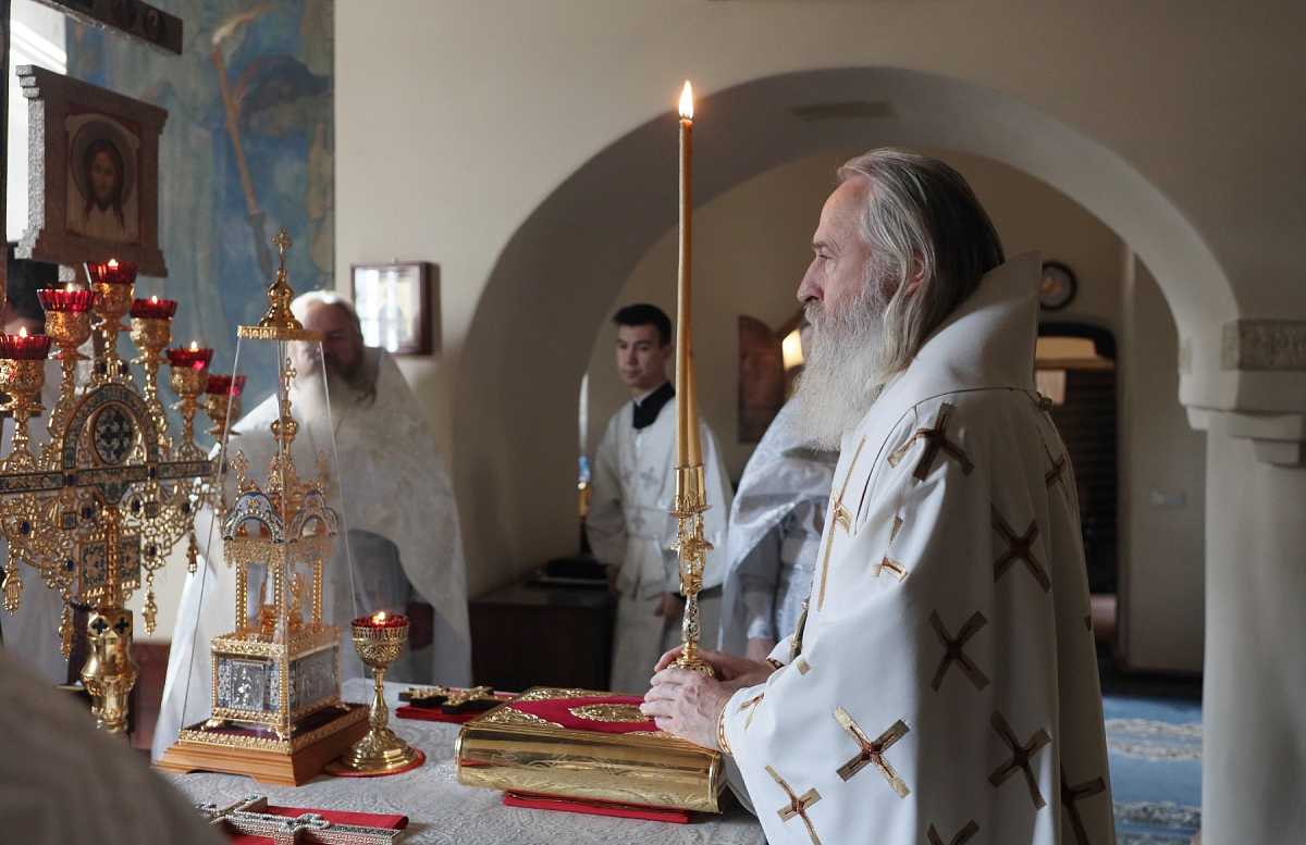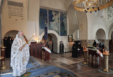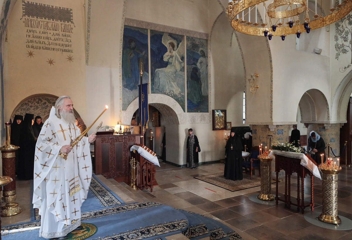 В главном монастырском храме в честь Покрова Пресвятой Богородицы Его Высокопреосвященству сослужили клирики Марфо-Мариинской обители.
