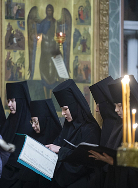Церковные песнопения исполнили: за ранней Литургией – хор воспитанниц и выпускниц Православного детского пансиона при монастыре, за поздней – хор сестер обители.