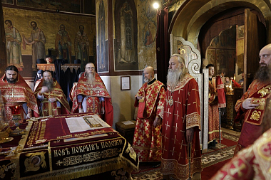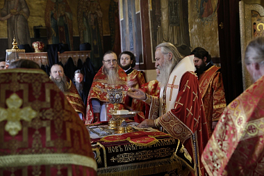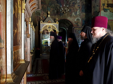 В соборе Рождества Божией Матери Его Высокопреосвященству сослужили наместник монастыря архимандрит Савва (Фатеев), скитоначальник Голгофо-Распятского Анзерского скита Спасо-Преображенского Соловецкого ставропигиального мужского монастыря игумен Евлогий (Стручилин), братия монастыря в священном сане.