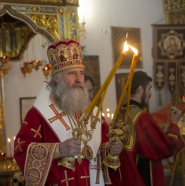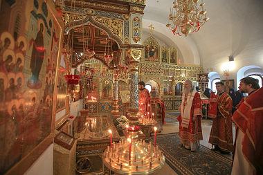 В Казанском приделе монастырского собора Рождества Пресвятой Богородицы Его Высокопреосвященству сослужило духовенство обители.