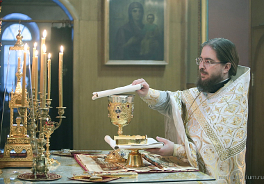 Диаконское служение возглавил протодиакон Владимир Назаркин, помощник председателя Отдела внешних церковных связей, в сослужении диакона Иоанна Афанасьева, клирика Троице-Сергиевой лавры, и штатного диакона подворья Андрея Ильинского.
