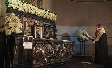 По прибытии в обитель архипастырь поклонился честным мощам святителя Тихона, Патриарха Московского и всея Руси.