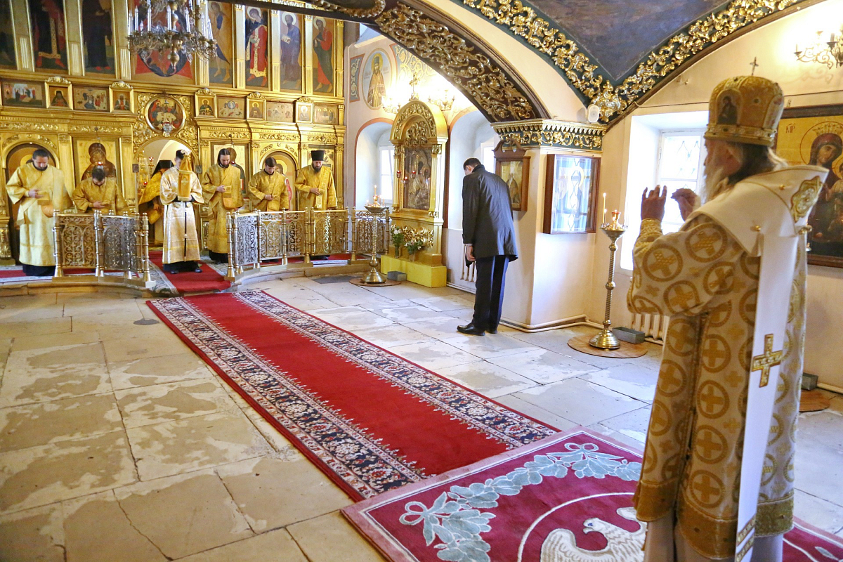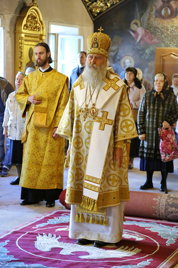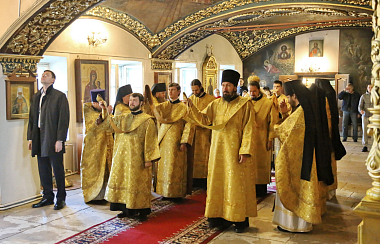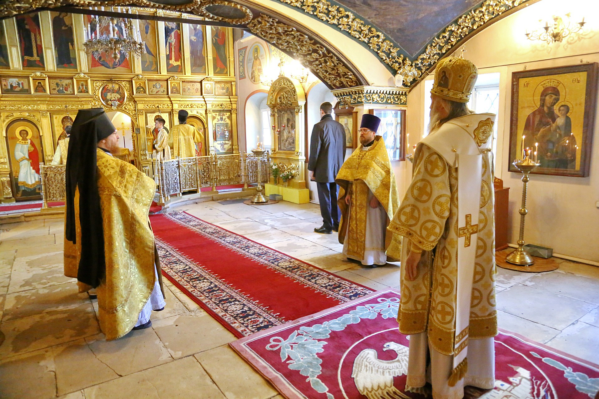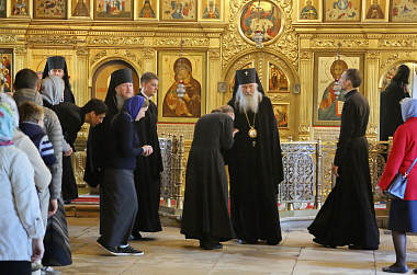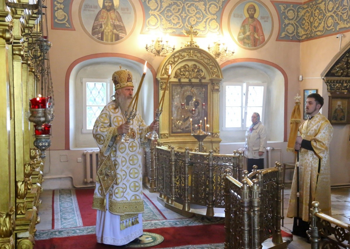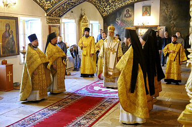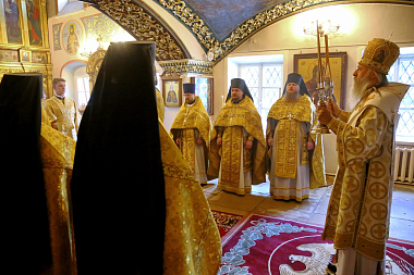 За богослужением в Успенском храме монастыря Его Высокопреосвященству сослужили наместник монастыря игумен Варфоломей (Петров) и духовенство обители.