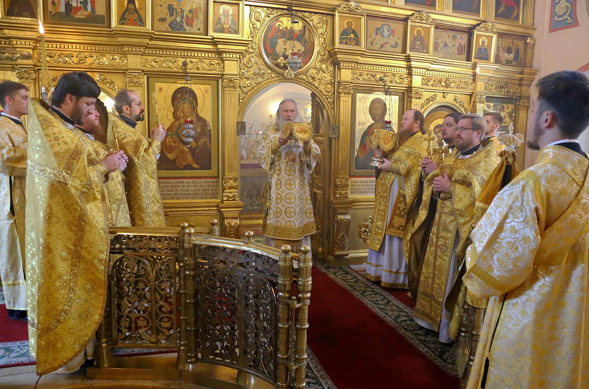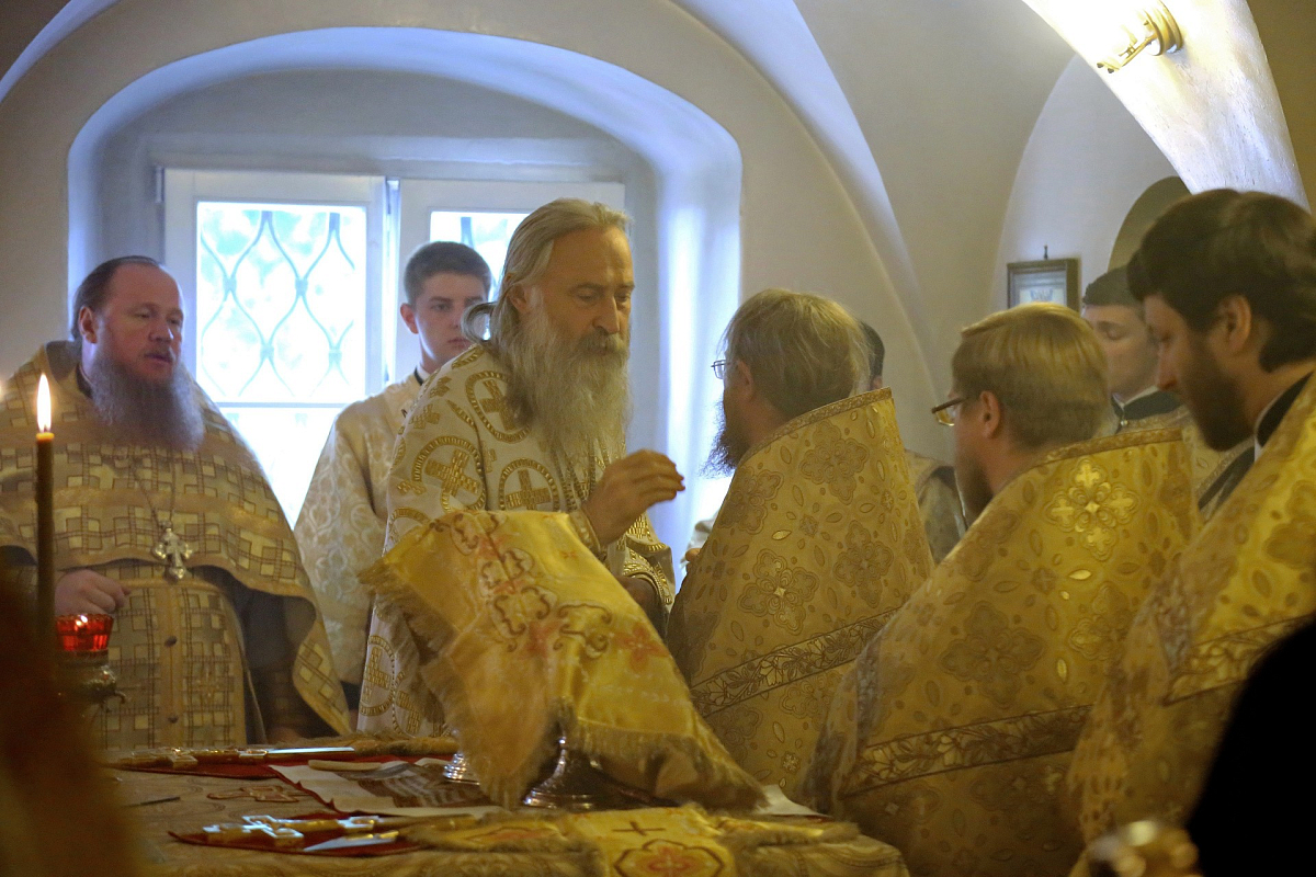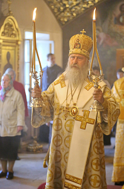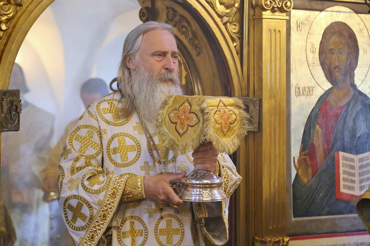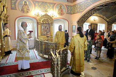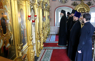 За богослужением в Успенском храме монастыря Его Высокопреосвященству сослужили наместник монастыря игумен Варфоломей (Петров) и духовенство обители.