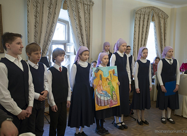 В завершение учащиеся ЧОУ «Школа при Алексеевском монастыре» представили всем собравшимся житие преподобного Алексия, человека Божия, в поэтической форме, сопровождая чтение рисунками-иллюстрациями больших размеров.