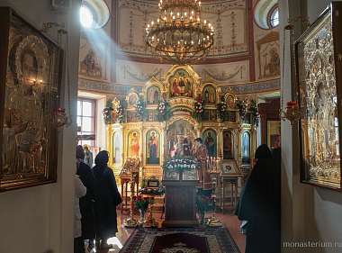 Накануне в Борисоглебском приделе Троицкого храма обители Собором монастырского духовенства было отслужено торжественное всенощное бдение с литией и пением акафиста Небесным покровителям монастыря.