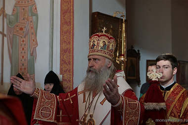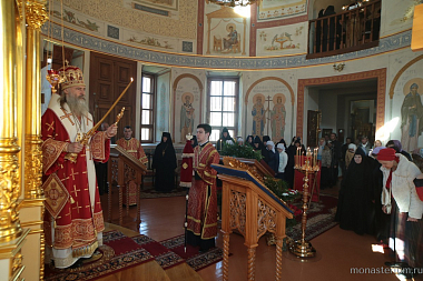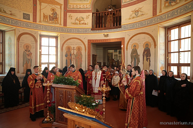 Его Высокопреосвященству сослужили заместитель председателя Синодального отдела по монастырям и монашеству архимандрит Стефан (Тараканов), монастырское духовенство и гости в священном сане.
