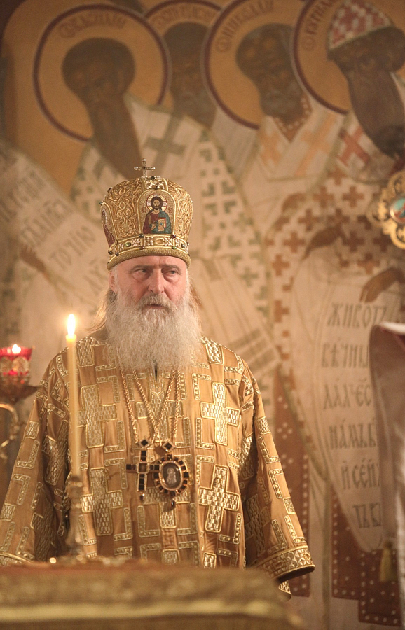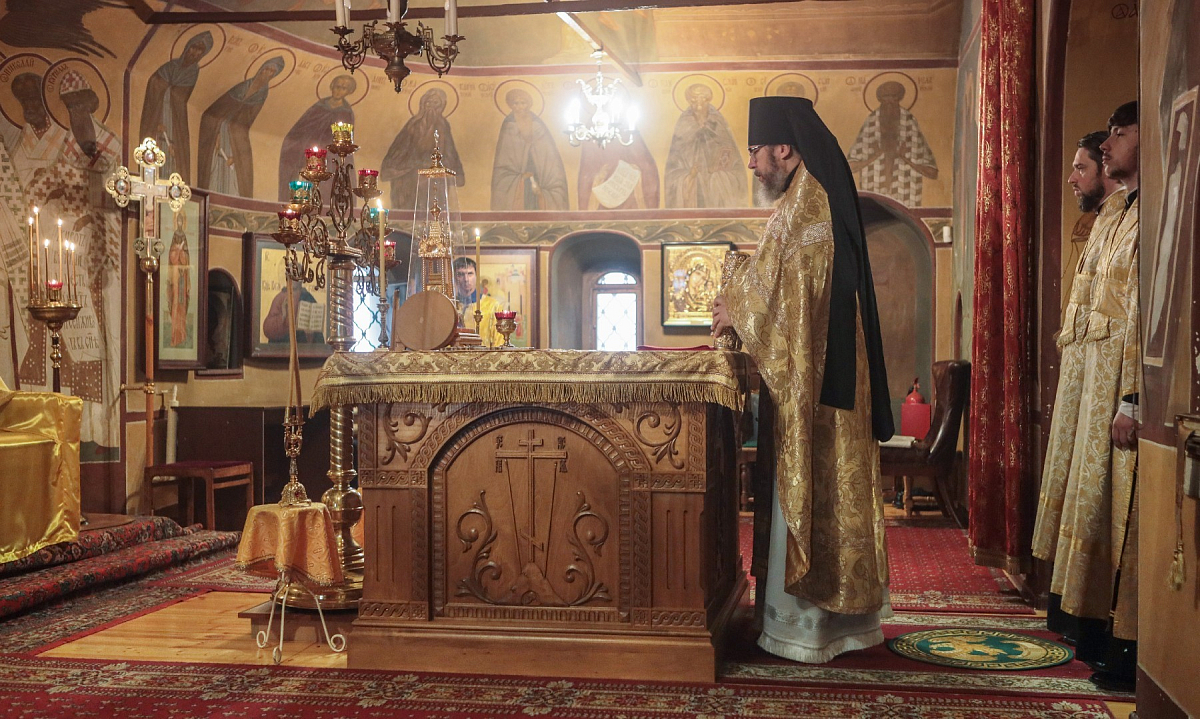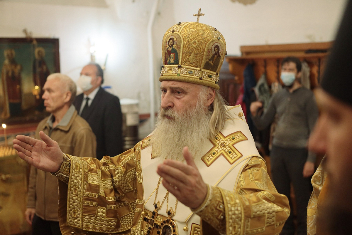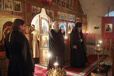 Его Высокопреосвященству сослужили и. о. наместника Заиконоспасского монастыря иеромонах Даниил (Константинов), братия обители в священном сане.