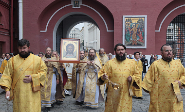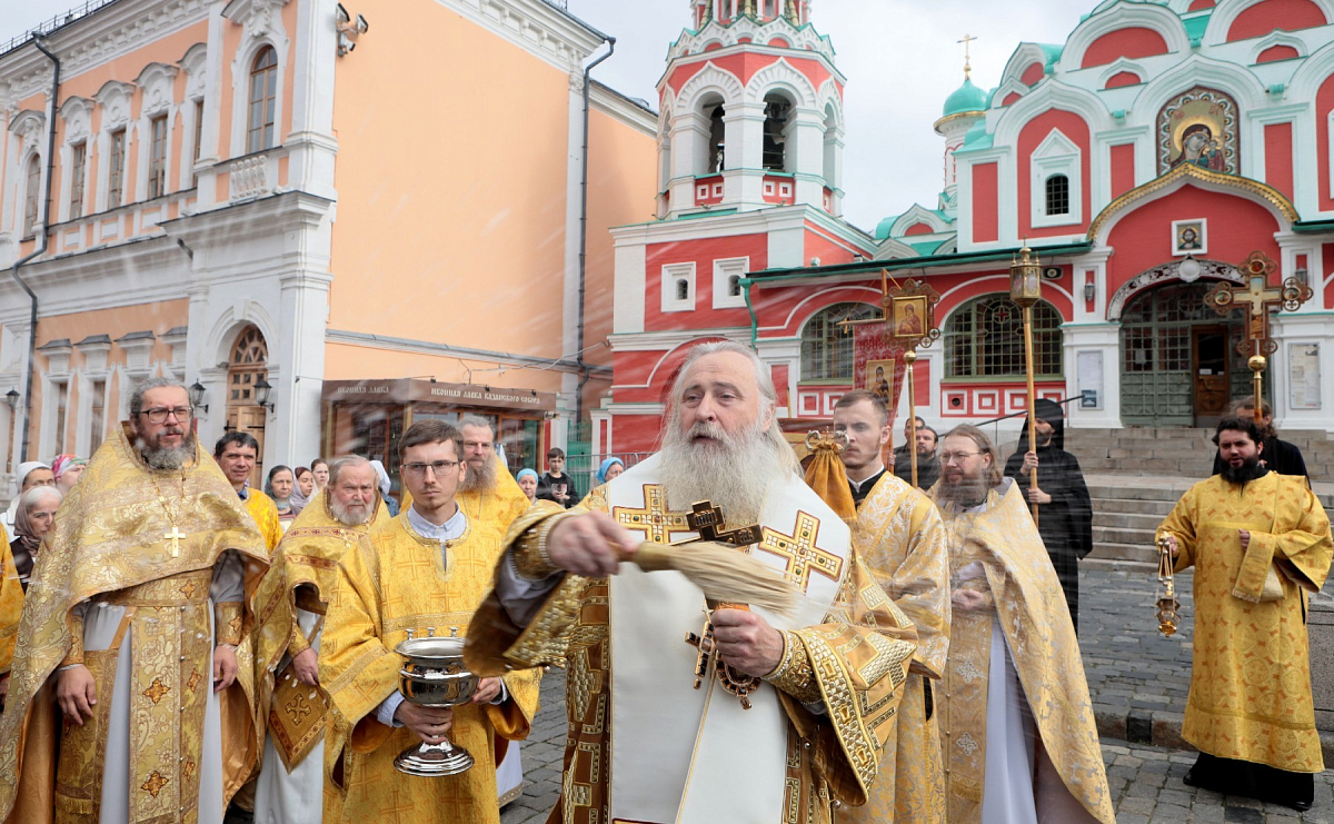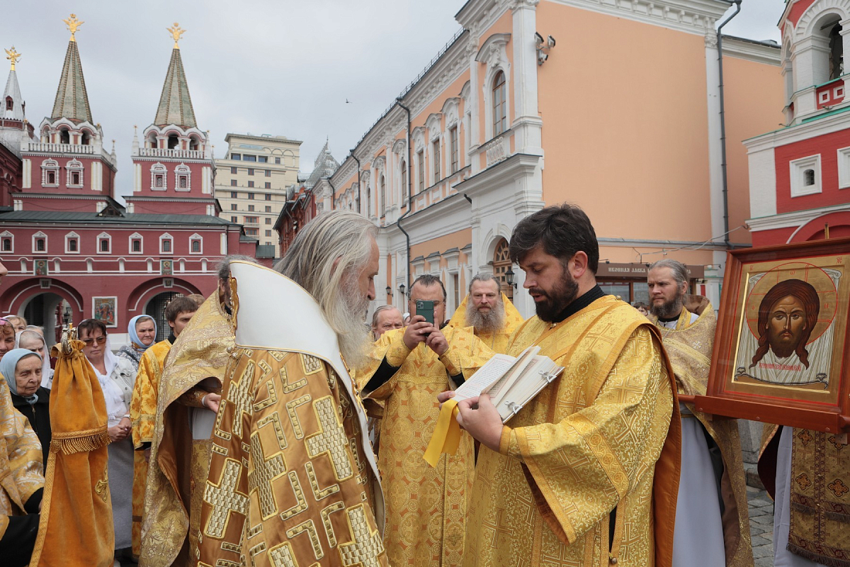 По заамвонной молитве состоялся крестный ход. Торжественная процессия прошла от Заиконоспасского монастыря по Никольской улице к месту, где находился Николо-Греческий монастырь, затем к Воскресенским воротам, далее к Казанскому собору на Красной площади и возвратилась в Заиконоспасский монастырь.