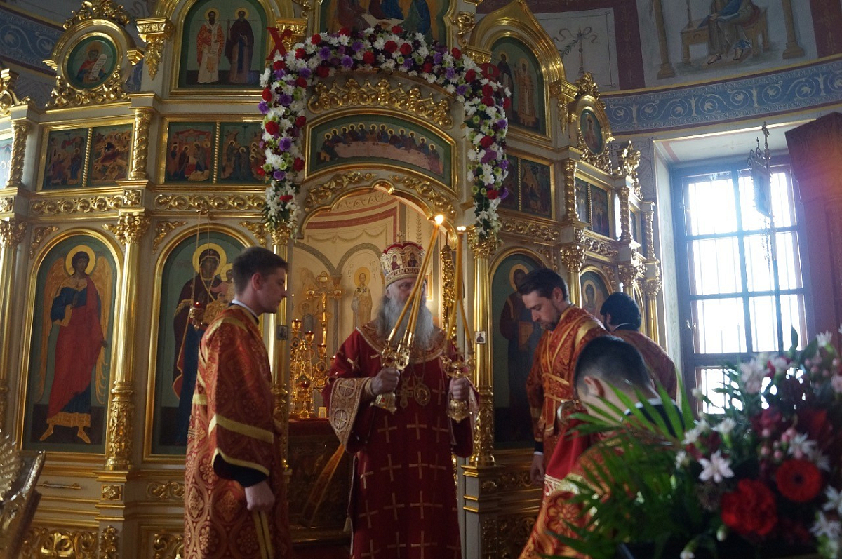 По заамвонной молитве архиепископ Феогност возглавил праздничный крестный ход, в ходе которого под пасхальные песнопения с чтением Евангелия владыка и сослужащее духовенство окропили богомольцев святой водой.