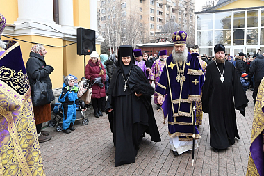 Его Высокопреосвященству сослужили: заместитель председателя Синодального отдела по монастырям и монашеству архимандрит Стефан (Тараканов); протоиерей Владимир Диваков, секретарь Патриарха Московского и всея Руси по г. Москве и клирики обители.