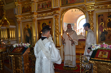 За Божественной литургией Его Высокопреосвященству сослужили клирики обители.
