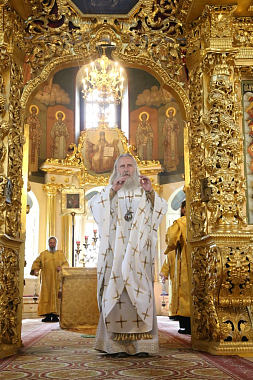 Его Высокопреосвященство совершил Божественную литургию в Успенском соборе обители.