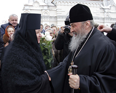 По окончании Литургии Предстоятель Украинской Православной Церкви отслужил праздничный молебен перед чудотворной иконой Божией Матери «Споручница грешных», в заключение которого поблагодарил всех прибывших на торжество архипастырей, игумению Рафаилу (Хильчук) и сестер обители за совместные молитвы и поздравил всех верующих с праздником.