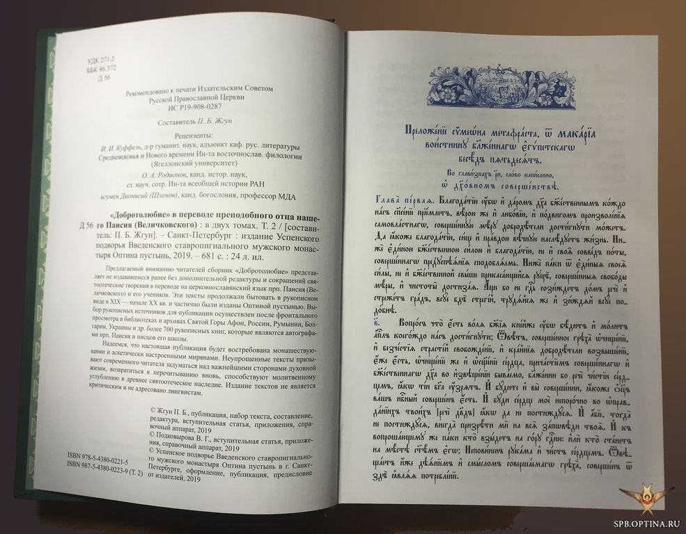 На подворье мужского монастыря Оптина пустынь в Санкт-Петербурге издали «Добротолюбие» в переводе преподобного Паисия (Величковского).