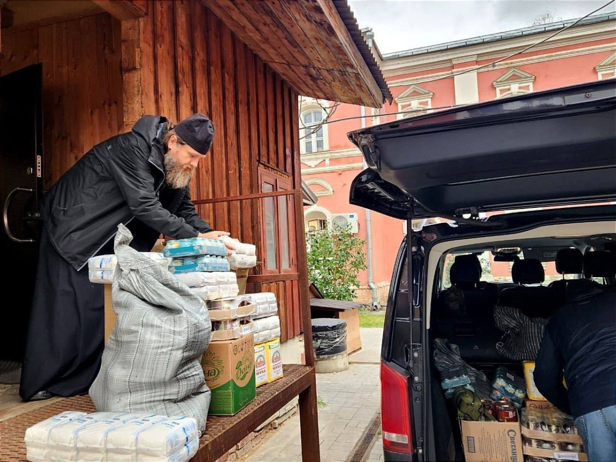 Добровольцы во главе с иеромонахом Косьмой (Афанасьевым) передали от Донского монастыря гречку, тушёнку, детское питание, макаронные изделия, крупы, муку и другие нужные продукты, а также монастырские яблоки.