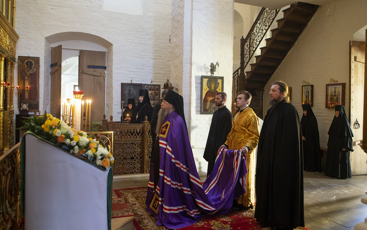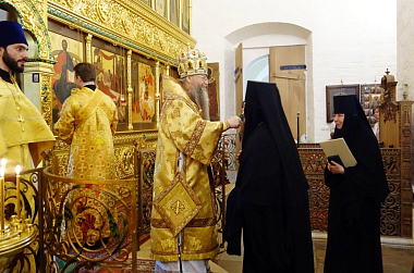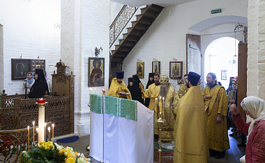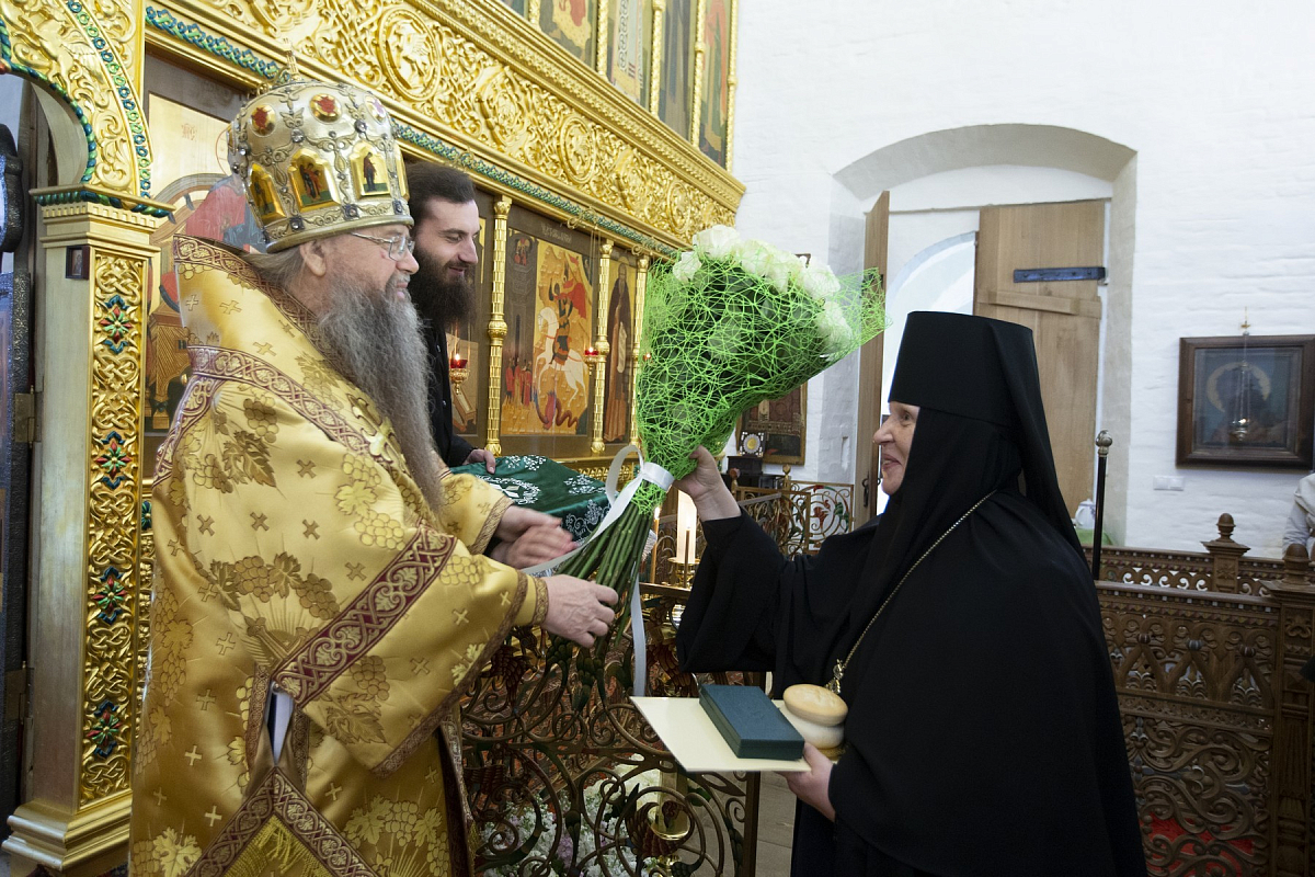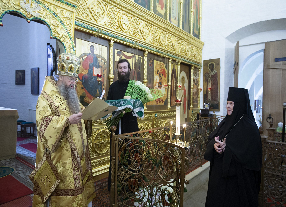 По окончании Литургии и благодарственного молебна Преосвященнейший Алексий передал настоятельнице обители игумении Викторине поздравление Святейшего Патриарха Московского и всея Руси Кирилла по случаю 65-летия со дня рождения: