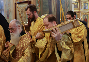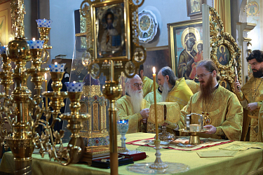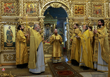 Его Преосвященству сослужили клирики подворья. Сестринский хор исполнил богослужебные песнопения. По окончании Литургии, по благословению Патриарха Московского и всея Руси Кирилла было совершено молебное пение святителю Николаю о всех православных христианах, во узах темничных пребывающих. Преосвященный владыка обратился с архипастырским словом к участникам богослужения.