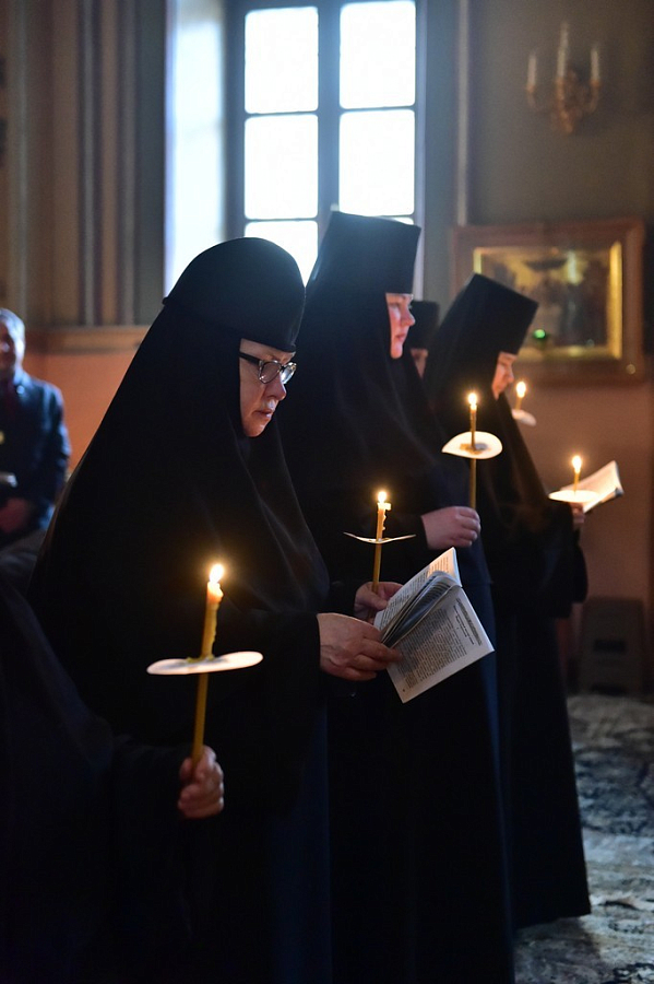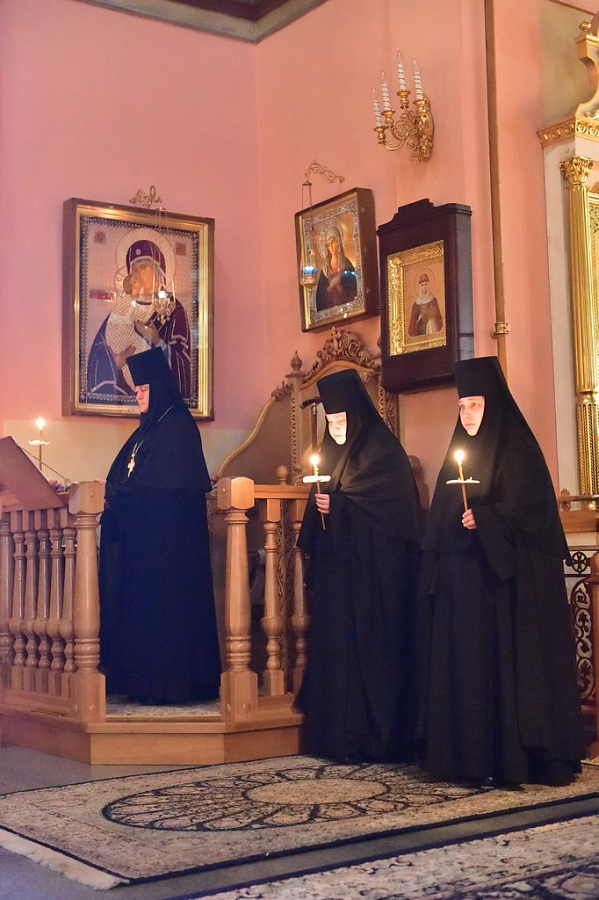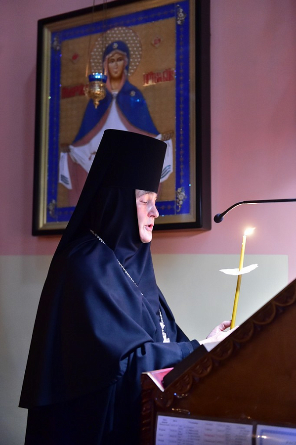Матушка игумения и сестры обители молились за богослужением и читали богослужебные тексты во время великого повечерия.