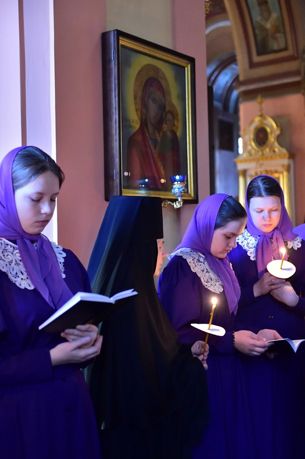 В течении всего покаянного канона прп. Андрея Критского и дальнейших частей великого повечерия в храме молились воспитанницы детского приюта при Покровском монастыре, прихожане и паломники обители.