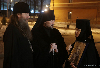 В завершение епископ Иероним поблагодарил игумению Ксению и духовника Алексеевской обители протоиерея Артемия Владимирова за гостеприимство, хор – за молитвенное пение и преподнес в дар монастырю икону свт. Григория Неокесарийского.