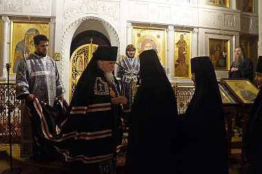 Его Преосвященство встречали руководитель Правового управления Московской Патриархии, настоятельница Алексеевского монастыря игумения Ксения (Чернега) с сестрами, старший священник и духовник обители протоиерей Артемий Владимиров, клирики монастыря.