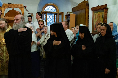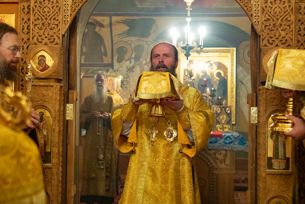 Его Преосвященству сослужили и.о. наместника Заиконоспасского монастыря иеромонах Даниил (Константинов), братия обители в священном сане.