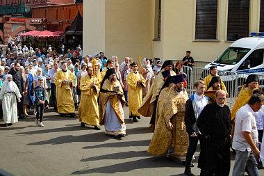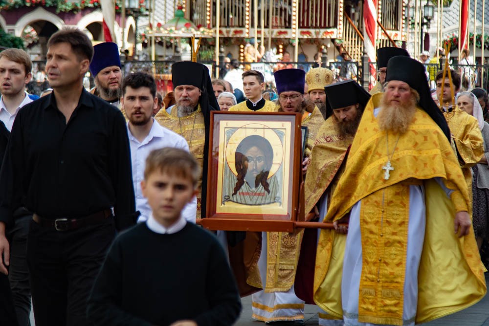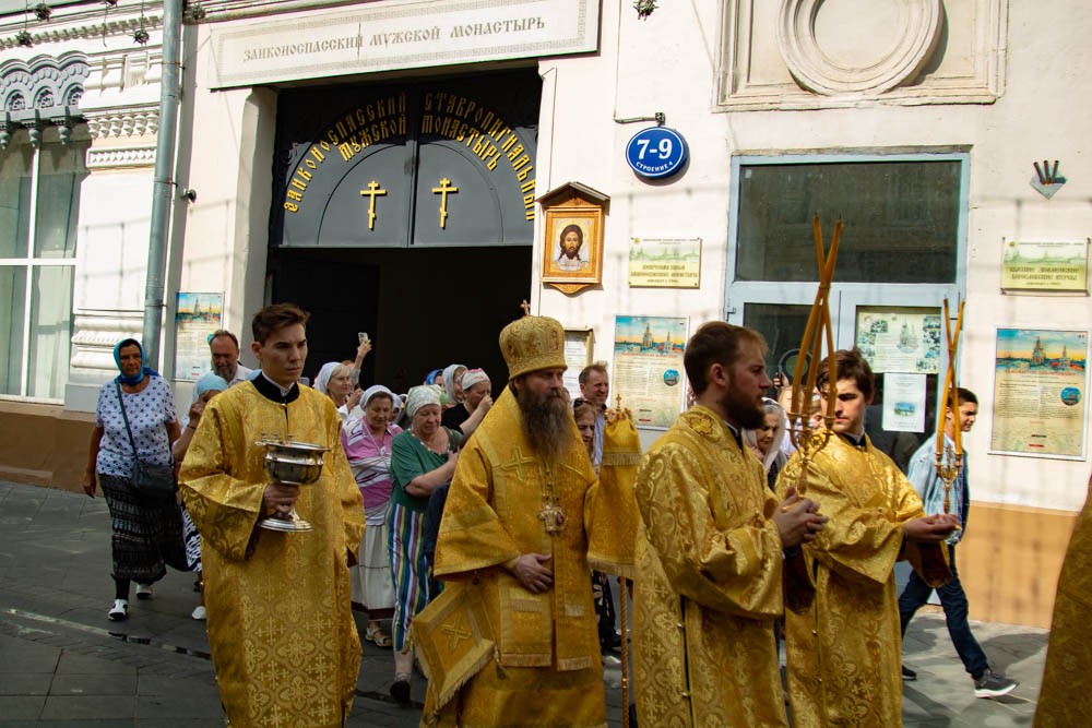 По окончании богослужения состоялся крестный ход вокруг территории обители. Торжественная процессия проследовала от врат монастыря по Никольской улице к месту бывшего Никольского собора Николо-Греческого монастыря, затем через Воскресенские ворота и Красную площадь обратно в Заиконоспасский монастырь.