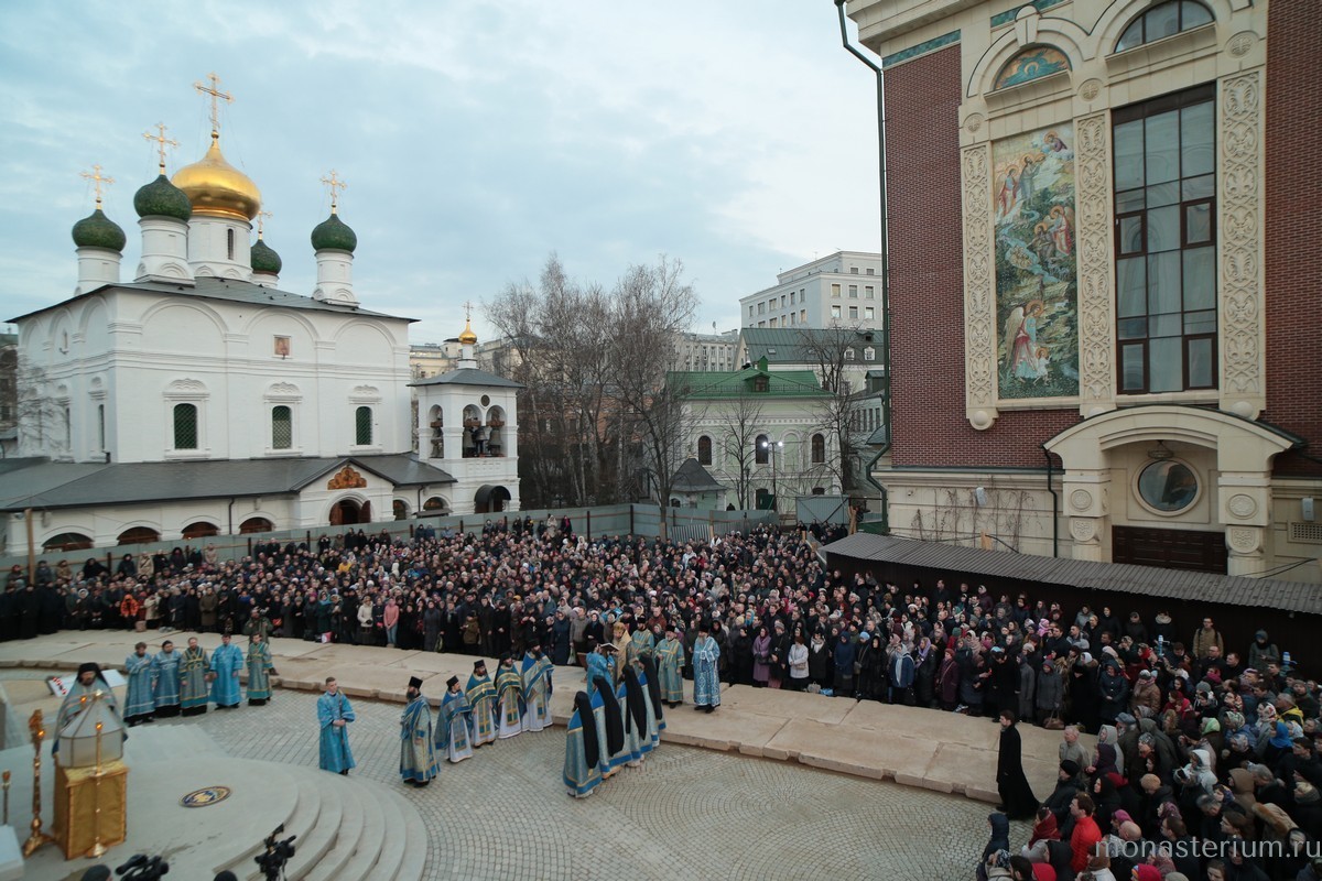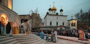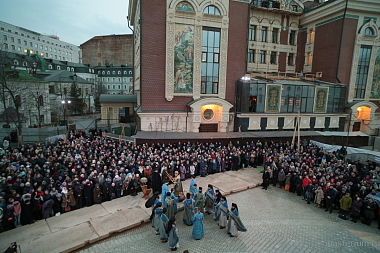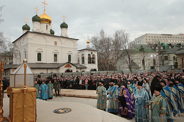 Наверное, это неслучайно. Первая служба здесь, в Сретенском монастыре, на Сретение Господне 1994 года произошла тоже на улице, мы помним это. И первая служба перед новым храмом не нарочито, а вот так само собой получилось, происходит тоже под открытым небом в великом храме мира Божия, в котором все мы живем.