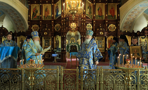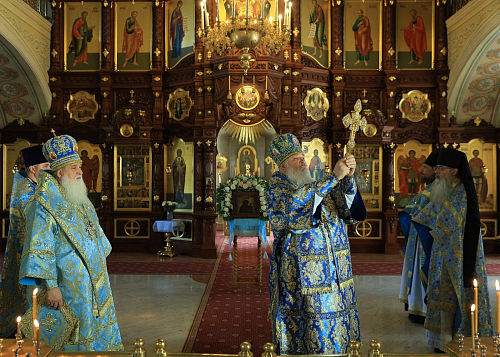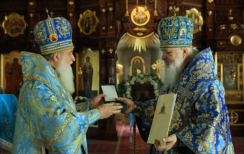 Епископ Роман зачитал поздравление Святейшего Патриарха Московского и всея Руси Кирилла епископу Тихону с 25-летием архиерейской хиротонии. Владыка Роман преподнес от себя владыке Тихону панагию.