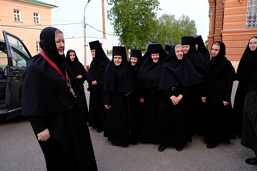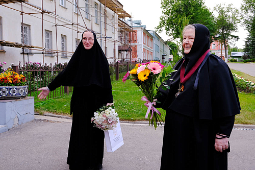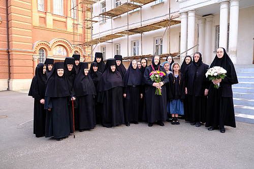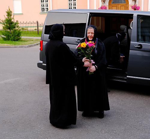 В Покровском Хотькове монастыре матушку игумению торжественно встретили сестры и воспитанницы Детского пансиона, сердечно поздравили ее и преподнесли цветы.